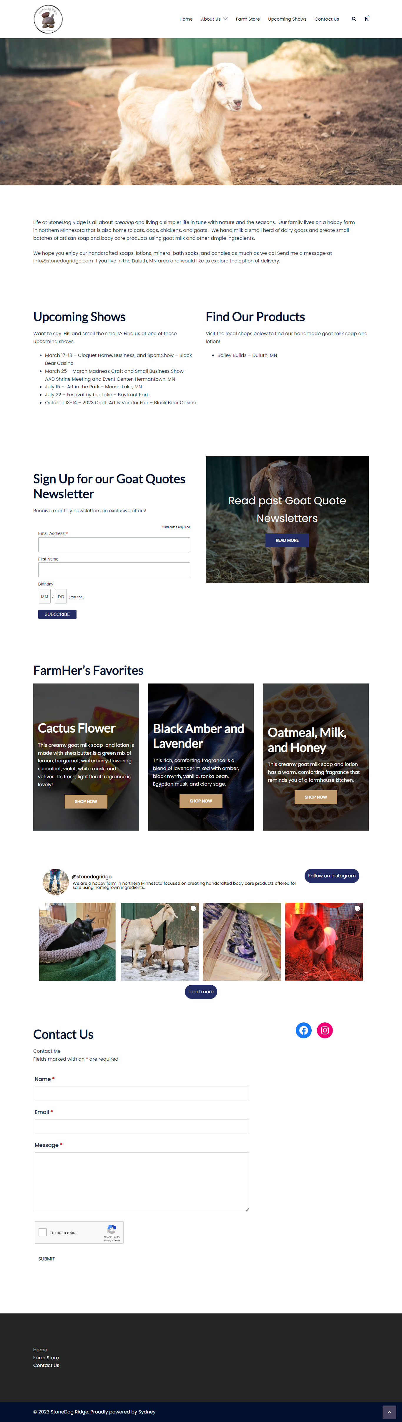 StoneDog Ridge is a small business who creates body care products made from goat milk. I designed their new website and product packaging, set up an ecommerce store, optimized their site with SEO practices, and took all product and farm photos. Additionally, I manage their social media presence, aid in writing newsletters, and keep track of statistics through Google Analytics.